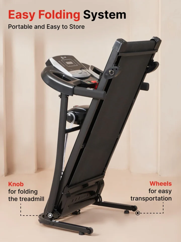 Designed for homes with limited space, the treadmill features a foldable design with a knob mechanism that makes setup and storage simple.